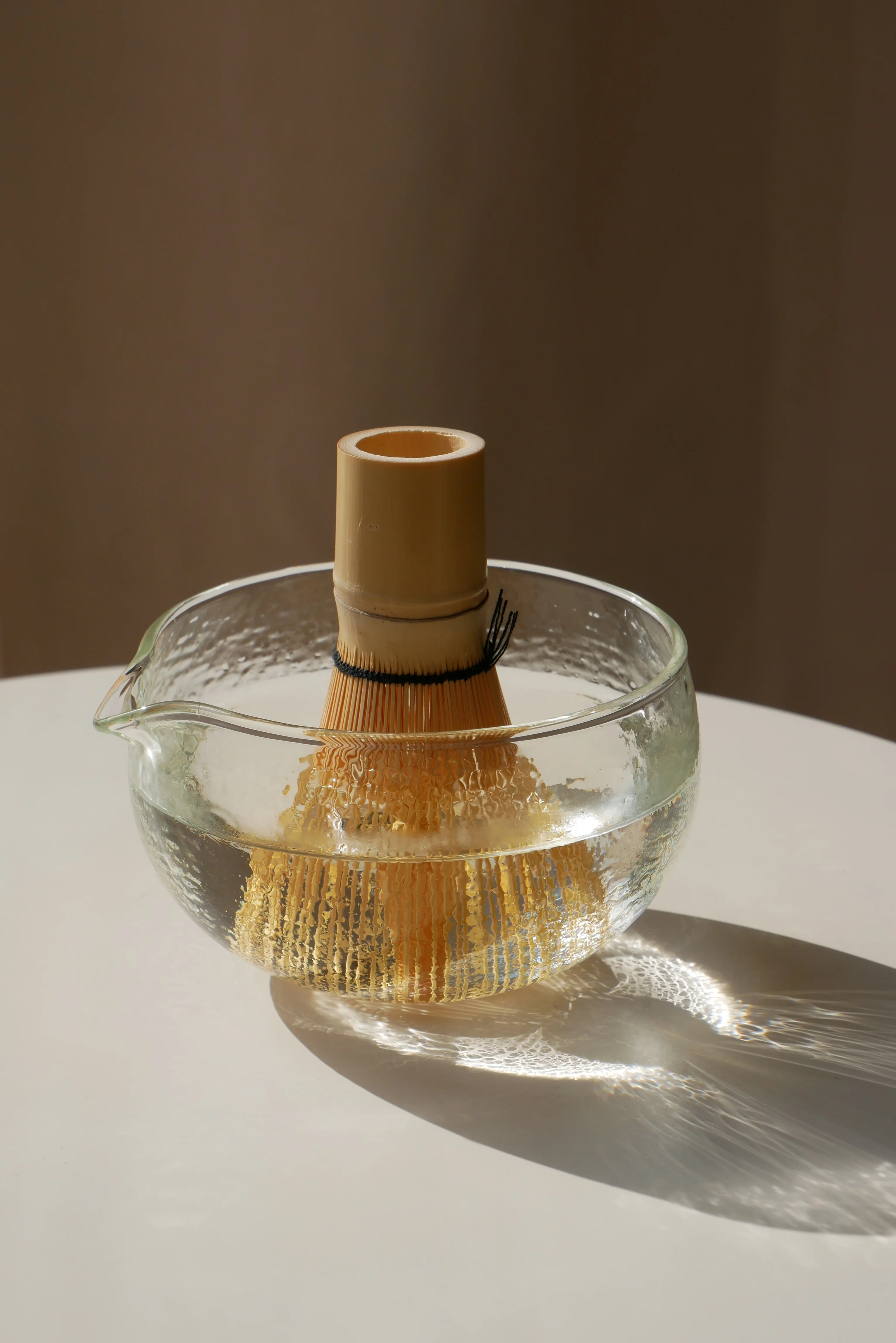 Das Mixen des Matchas fällt dank der glatten Oberfläche besonders leicht und sieht in dem strukturierten Glas wunderschön aus. Mit Hilfe des Ausgießers kannst du deinen Matcha ohne zukünftiges Verschütten in deinen Cup oder Chawan gießen. Man kann den Matcha selbstverständlich auch direkt aus der Schale genießen.